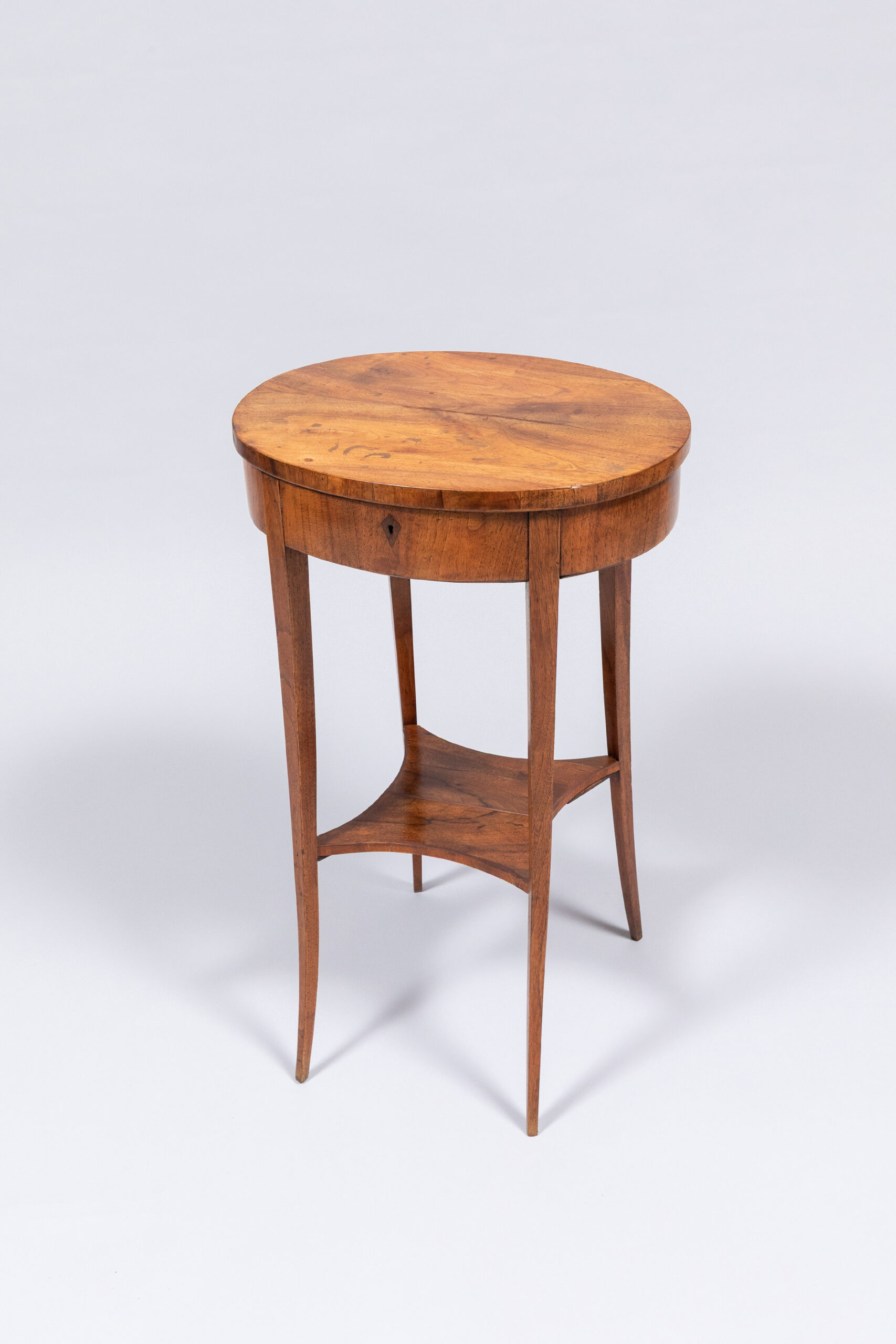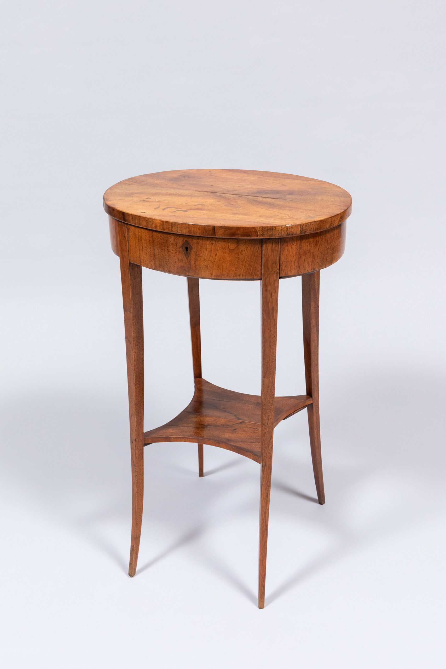 Durchmesser 96 cm. | Nr. 910 - Ovales Biedermeiertischchen mit verschließbarer Schublade.
