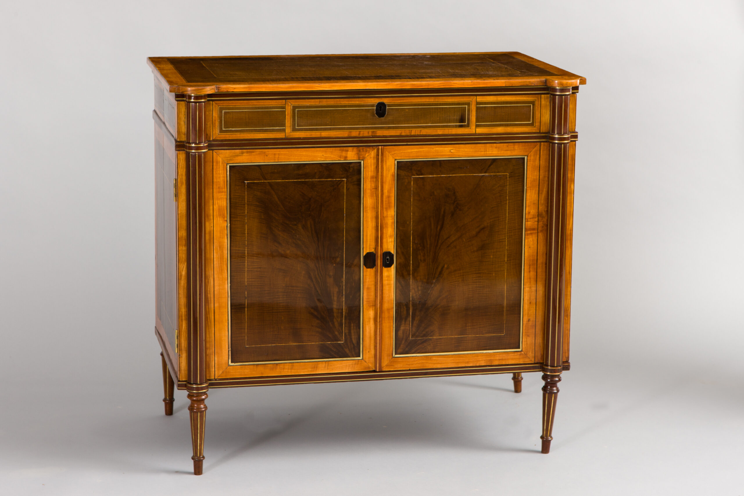 Kirschbaum auf Nadelholz furniert. Originale Messing- Schlüsselbuchsen, Schlösser sowie sehr fein gearbeitete Schlüssel.