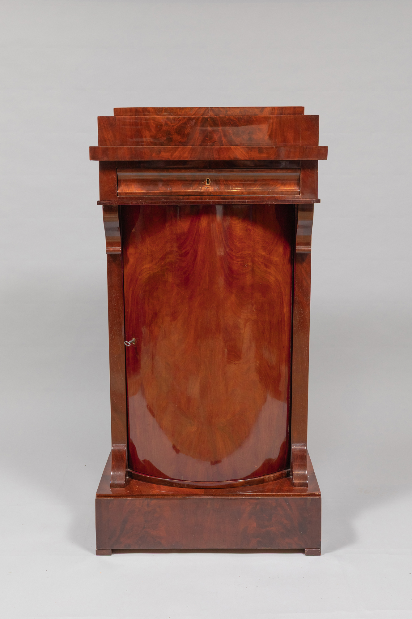Nr. 586 - Zierlicher Pfeiler- Halbschrank mit konvex geschweifter Tür, verdecktem Sockelschub sowie abschließbarem Kopfschub.