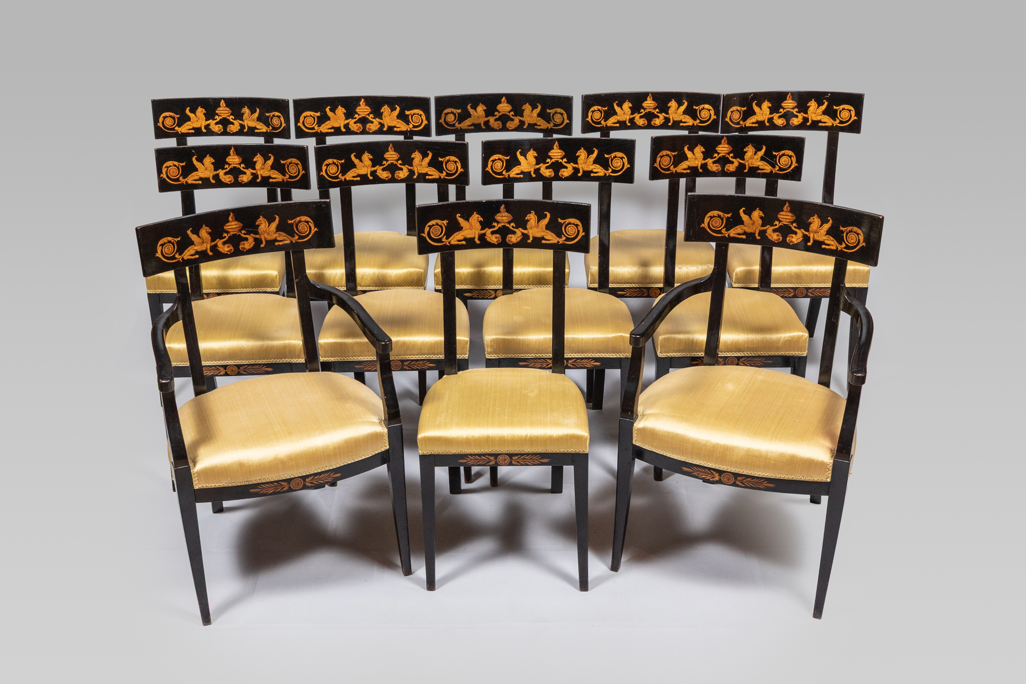 Nr. 19009 a - Bedeutende Folge von zehn Biedermeierstühlen und zwei Sesseln mit feinster figuraler und ornamentaler Goldmalerei.